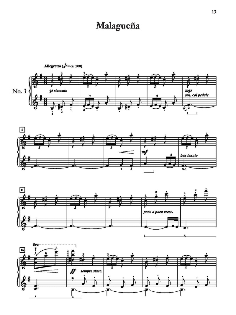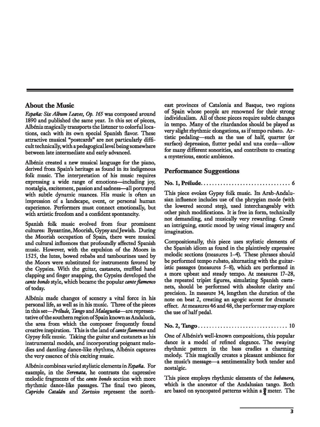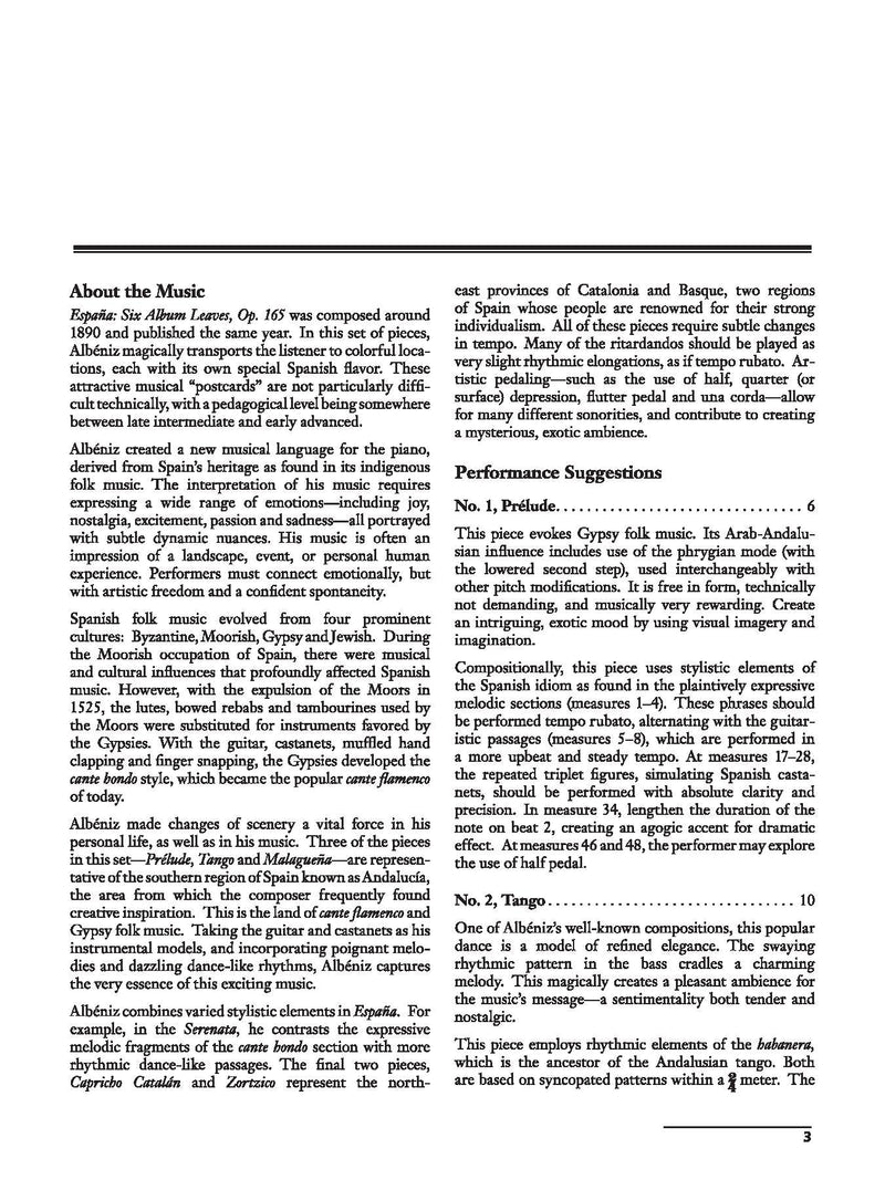 In España: Six Album Leaves, Op. 165, Albéniz magically transports the listener to colorful locations, each with its own special Spanish flavor. These musical "postcards" are not particularly difficult to play, and are somewhere between the late intermediate and early advanced levels. This edition aids in interpretation through added fingerings, pedal and indications for subtle changes in tempo, which are integral to the performance of Spanish music. Dr. Kuehl-White studied in Barcelona with legendary Spanish pianist Alicia de Larrocha, who provided a tremendous legacy regarding the performance practice traditions of Albéniz’s music. España was initially published with many errors and omissions. Over the years, editors have produced new editions with some corrections, but little interpretive assistance. This edition not only contains numerous corrections, but also aids in interpretation through various additions in the score.