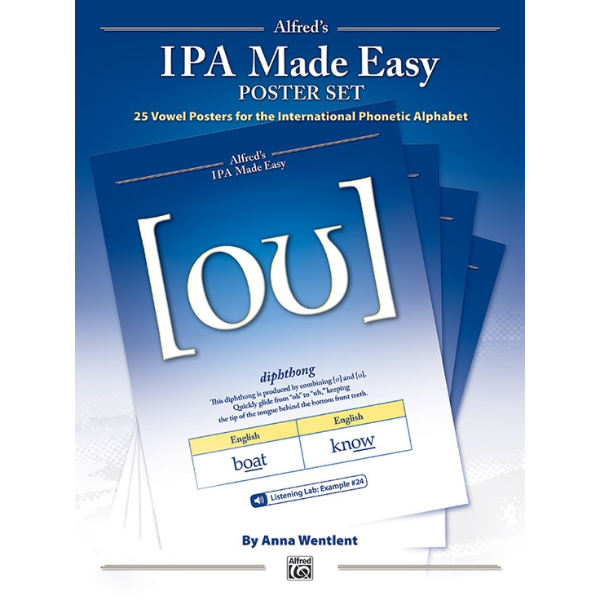 25 Vowel Posters for the International Phonetic Alphabet. This set of full-color 9" x 12" cardstock posters provides a practical tool for teaching the International Phonetic Alphabet and uniform vowel formation. Each poster displays one of the primary vowel sounds, including its IPA symbol, pronunciation, and example words in English, Latin, Italian, German, French, or Spanish. Plus, an online resource offers recorded demonstrations of every sound. Equally useful for choral rehearsal rooms and vocal studios!