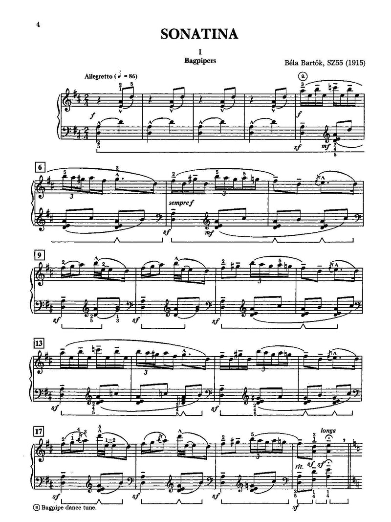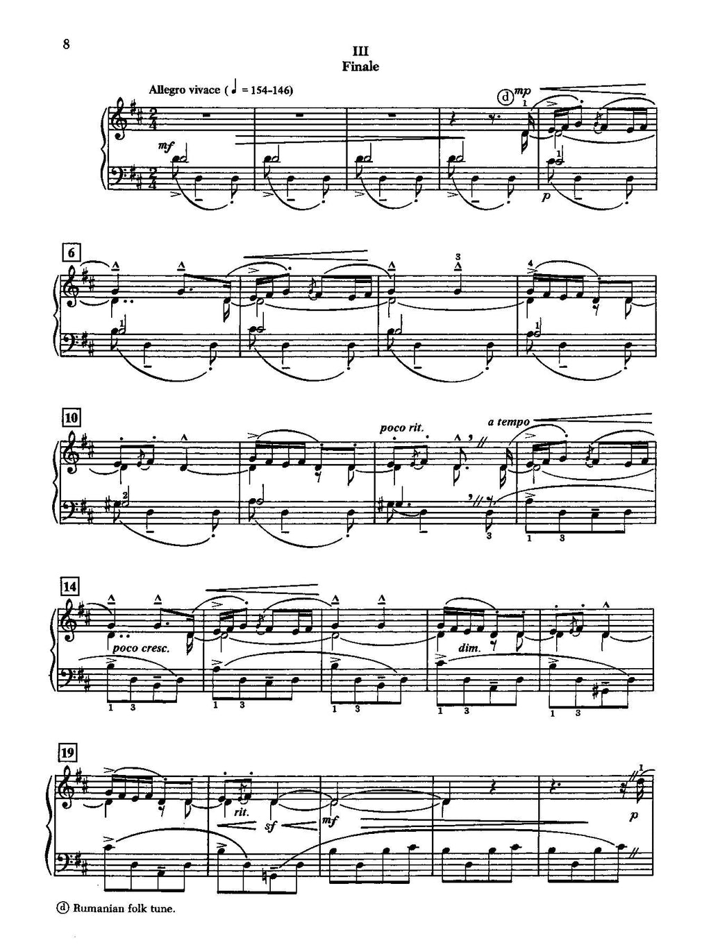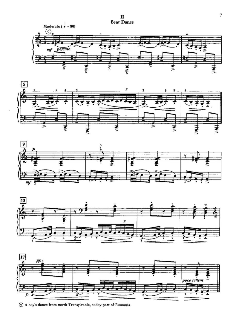 Originally conceived as part of a group of Rumanian folk dances for piano, these three movements are indeed dances, and are titled Bagpipers, Bear Dance, and Finale. There is a strong use of accents and rhythms in these descriptive pieces. Some fingering suggestions have been added by Maurice Hinson, but Bartok's performance and musical instructions have been retained.