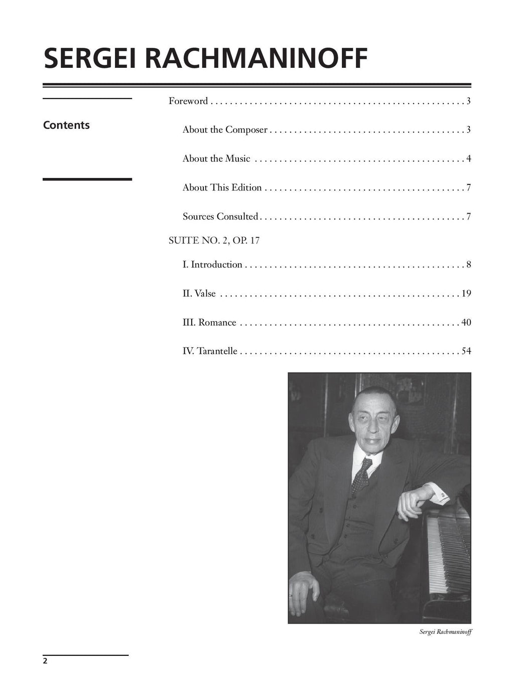 Written between 1900 and 1901, Suite No. 2 was premiered in 1901 by Rachmaninoff and Alexander Siloti. This virtuosic suite is orchestral in nature and contains four movements. The first movement serves as a march-like introduction, and the second and fourth movements are dances---a waltz and tarantella. Between the two dances is a slow third movement. Two copies required for performance.
