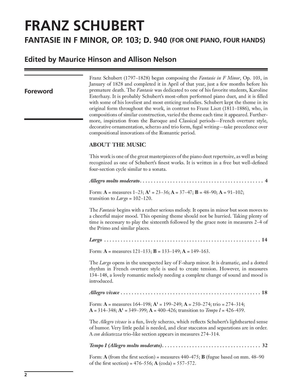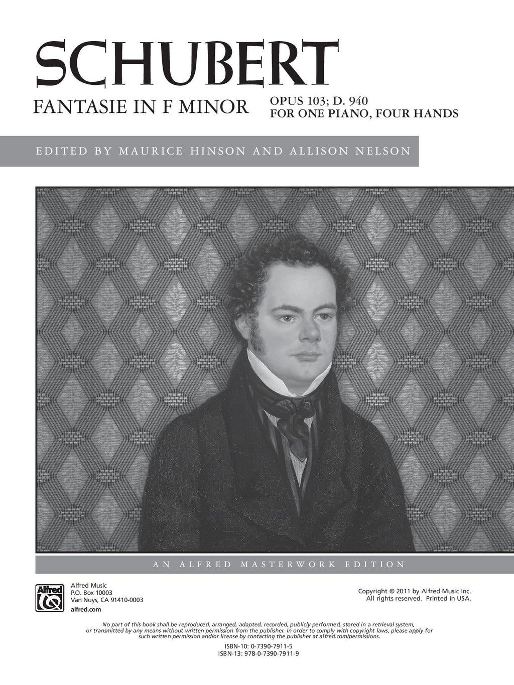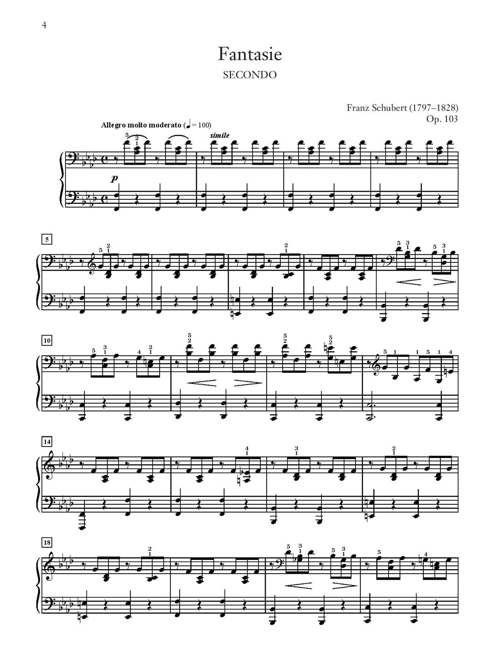 The Fantasie in F Minor, Op. 103, is Franz Schubert's most-often performed piano duet and is considered one of the great masterpieces of ensemble piano repertoire. Schubert completed the Fantasie in 1828, just a short time before his death later that year. The work demonstrates his mature style and is filled with some of his best writing. Its four connected movements contain lovely and enticing melodies, dramatic gestures in French overture style, a brilliant scherzo and trio, and a virtuosic fugue.