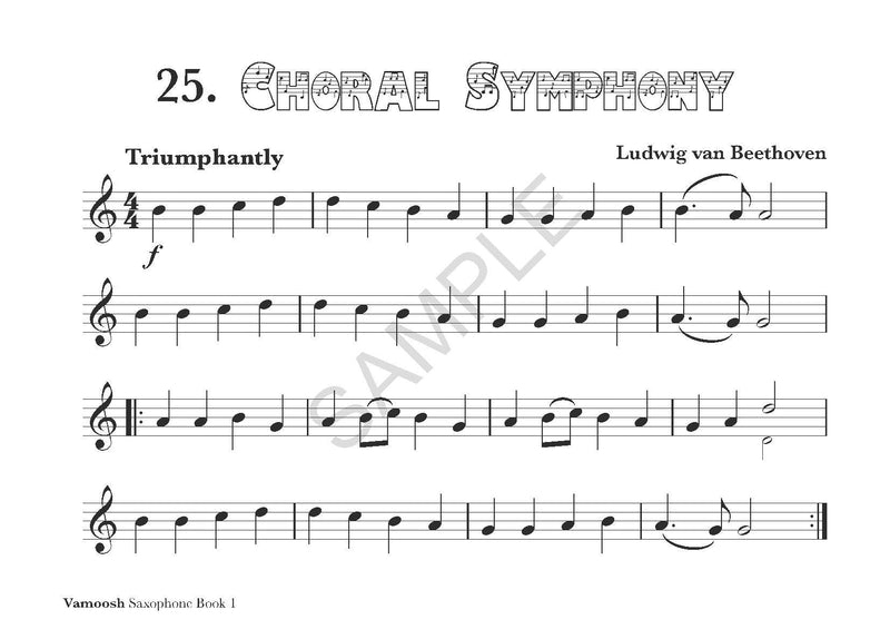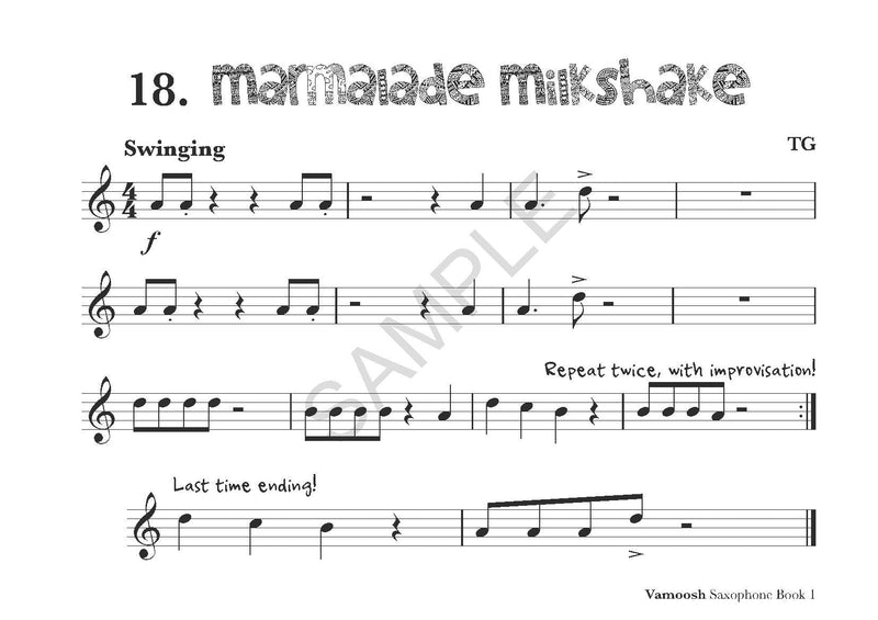 Vamoosh Saxophone Book 1 for alto Sax in Eb. Fun, user-friendly book full of varied and engaging pieces. Ideal for group or individual teaching. This book is fully compatible with Vamoosh Book 1 for both Clarinet, Trumpet and Trombone. Some items are compatible with other instruments in the Vamoosh series.