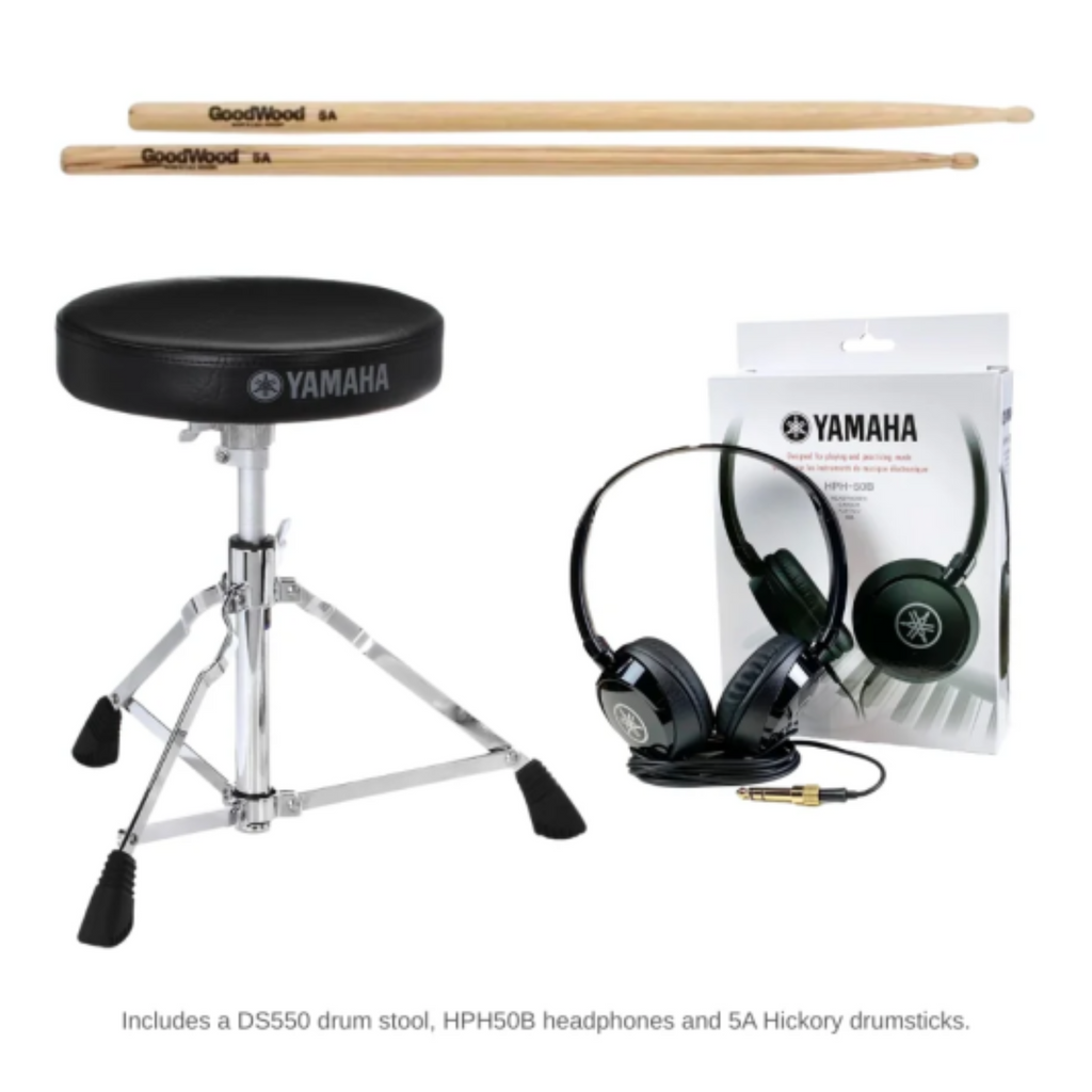 - Complete Beginner Bundle – Includes Yamaha DTX432K electronic drum kit, DS550 drum throne, HPH50B headphones, and 5A hickory drumsticks